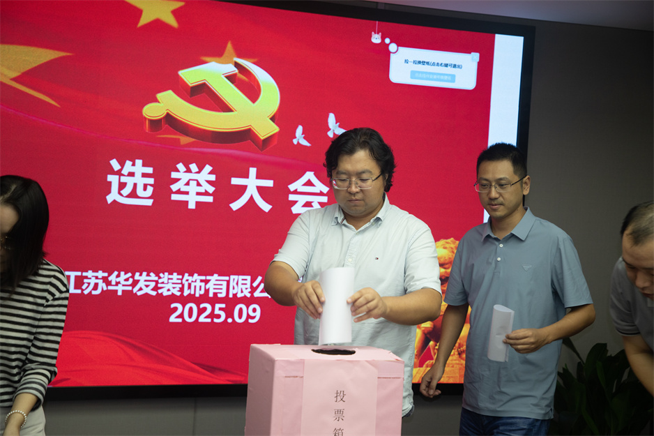 在莊嚴肅穆的國歌聲中,換屆選舉環節正式開始。會議宣讀了集團黨委關于同意華發黨總支召開黨員大會進行換屆選舉及候選人名單的批復,會議審議并通過了《籌備工作報告》、《中共江蘇華發裝飾有限公司總支委員會選舉辦法》、候選人名單、監票人及計票人名單。隨后,大會嚴格按照選舉程序,以無記名投票、差額選舉的方式,進行了現場投票。經公正計票,選舉產生陳明、朱崢光、朱明星、趙宏貴、李紅雨、徐家匯、顏吉利等7位同志為新一屆黨總支委員會委員。